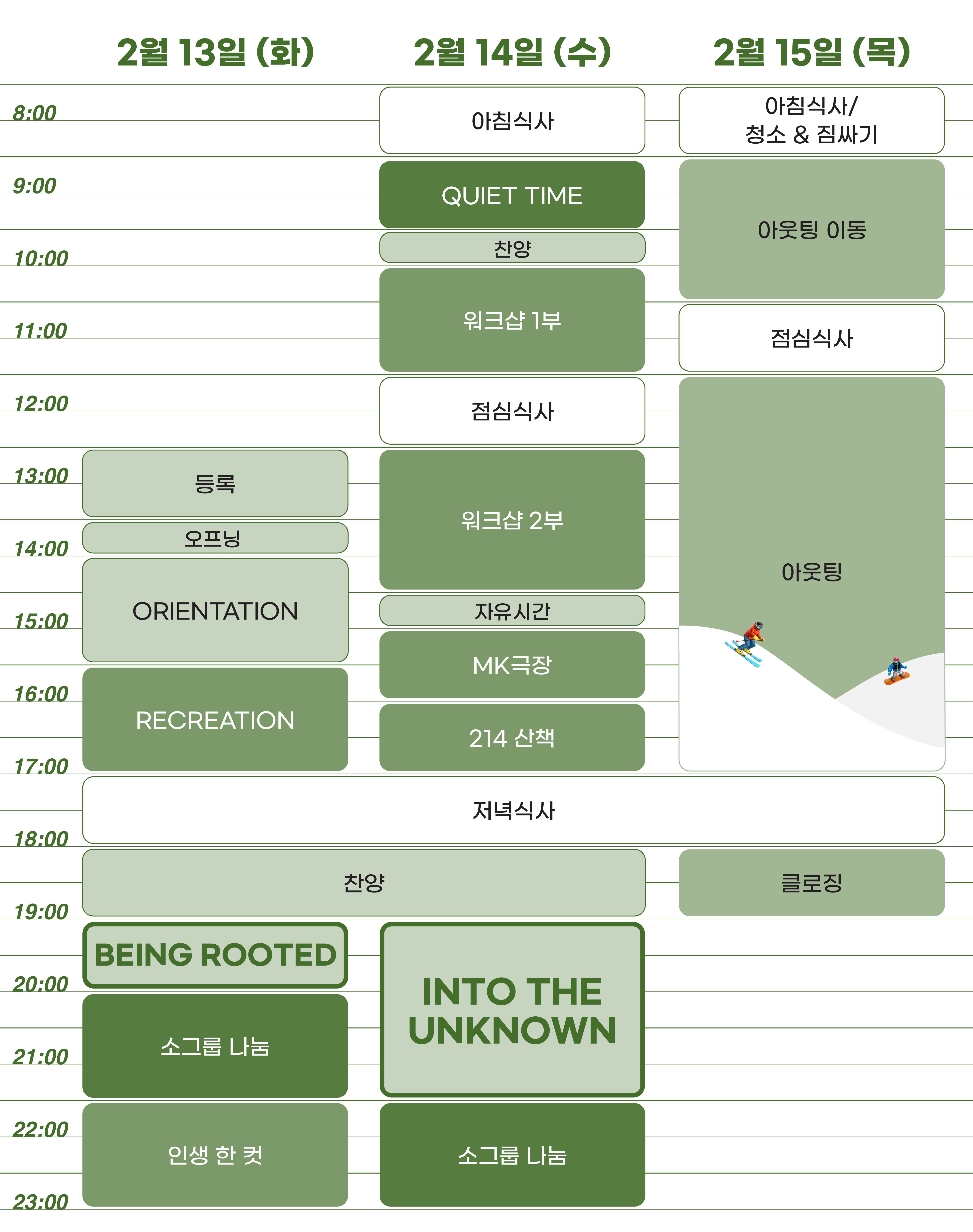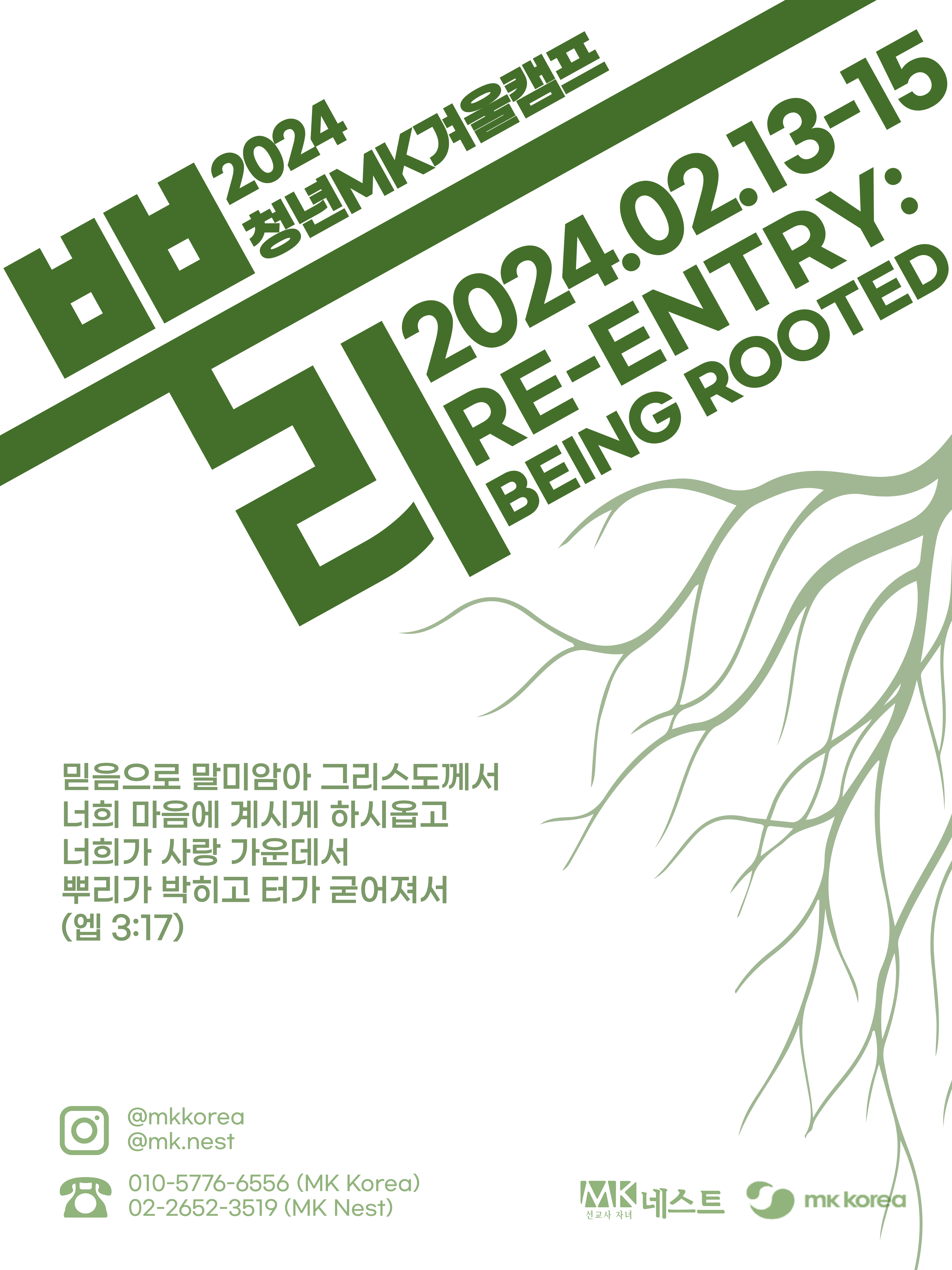 주제 해설: 에베소서 3:17-19 말씀을 바탕으로, 주제인 “RE-ENTRY: Being Rooted”는 MK들의 삶과 이들의 Re-Entry 과정 속 빠져서는 안되는 본질을 강조한다. 새롭게 한국 살이를 시작하는 MK들은 각기 다른 재입국 과정을 겪으며 다양한 어려움과 고민을 마주한다. 그러나, 오래 전부터 먼저 사랑해 오신 하나님이 계시고 그런 주님의 사랑에 뿌리 내림과 돌보심으로 어떤 어려움이 닥치더라도 굳건히 나아갈 수 있다는 것이다. 올해의 캠프를 통해 MK들이 하나님의 넘치는 사랑을 다시금 기억하고 Re-Entry의 모든 과정을 책임져주실 주님의 은혜를 기대하는 시간이 되길 소망한다.