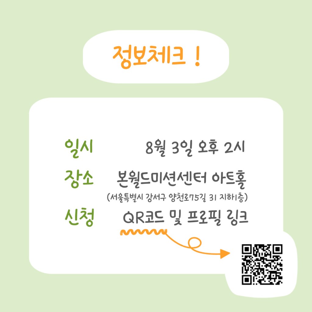 - 장소: 서울 강서구 양천로75길31 | 본월드미션센터 아트홀